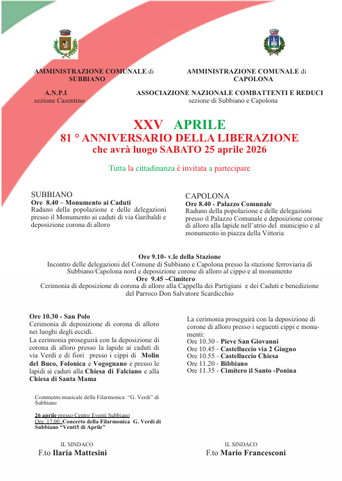 Celebrazioni del 25 Aprile: 81° Anniversario della Liberazione a Subbiano e Capolona. Sabato 25 aprile raduni dalle 8.40 e deposizioni corone nei luoghi della memoria. Il 26 aprile ore 17.00 concerto della Filarmonica G. Verdi. Programma in allegato.