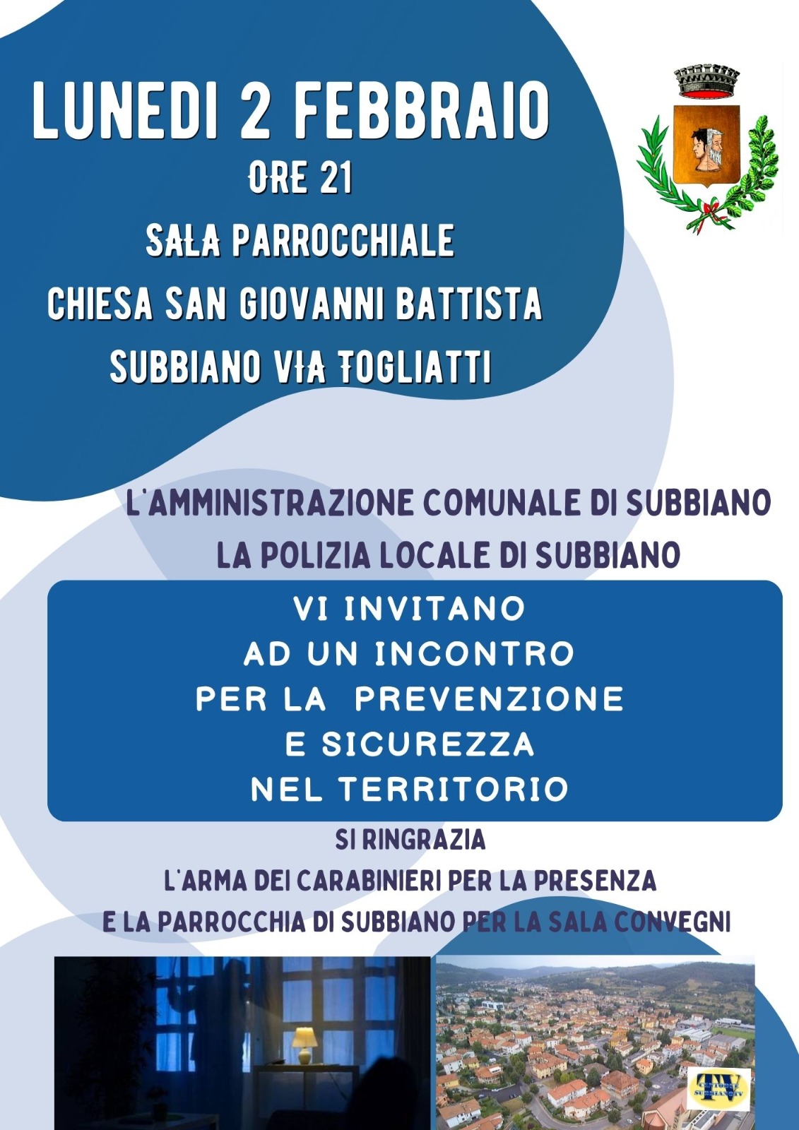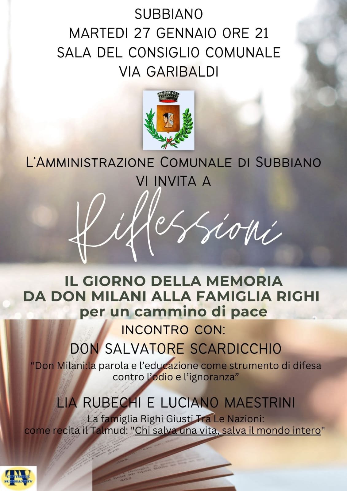 L'Amministrazione Comunale di Subbiano invita la cittadinanza a partecipare all'evento "Riflessioni", una serata dedicata al Giorno della Memoria per tracciare insieme un cammino di pace. Martedì 27 Gennaio ore 21:00, Sala del Consiglio Comunale.