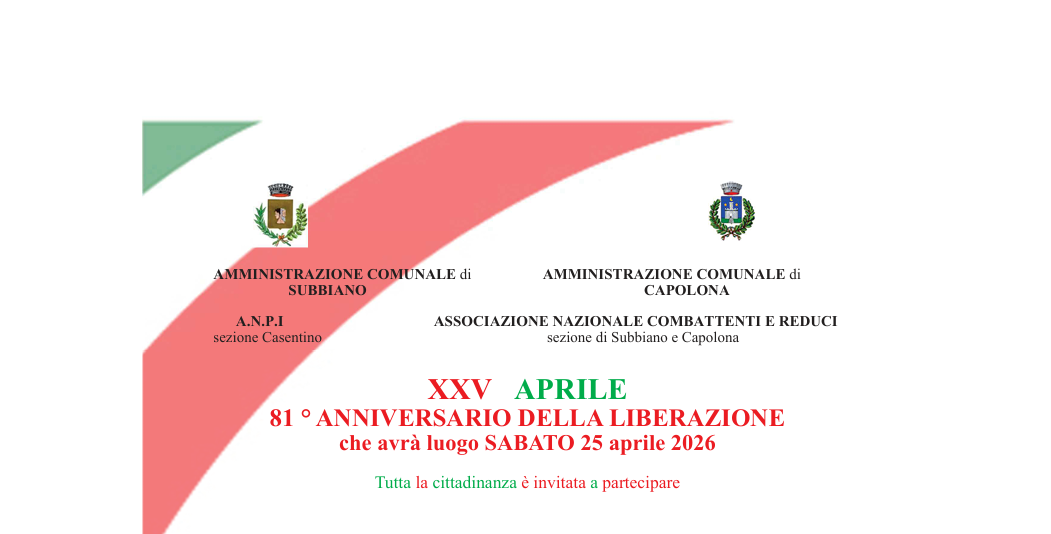 Celebrazioni del 25 Aprile: 81° Anniversario della Liberazione a Subbiano e Capolona. Sabato 25 aprile raduni dalle 8.40 e deposizioni corone nei luoghi della memoria. Il 26 aprile ore 17.00 concerto della Filarmonica G. Verdi. Programma in allegato.