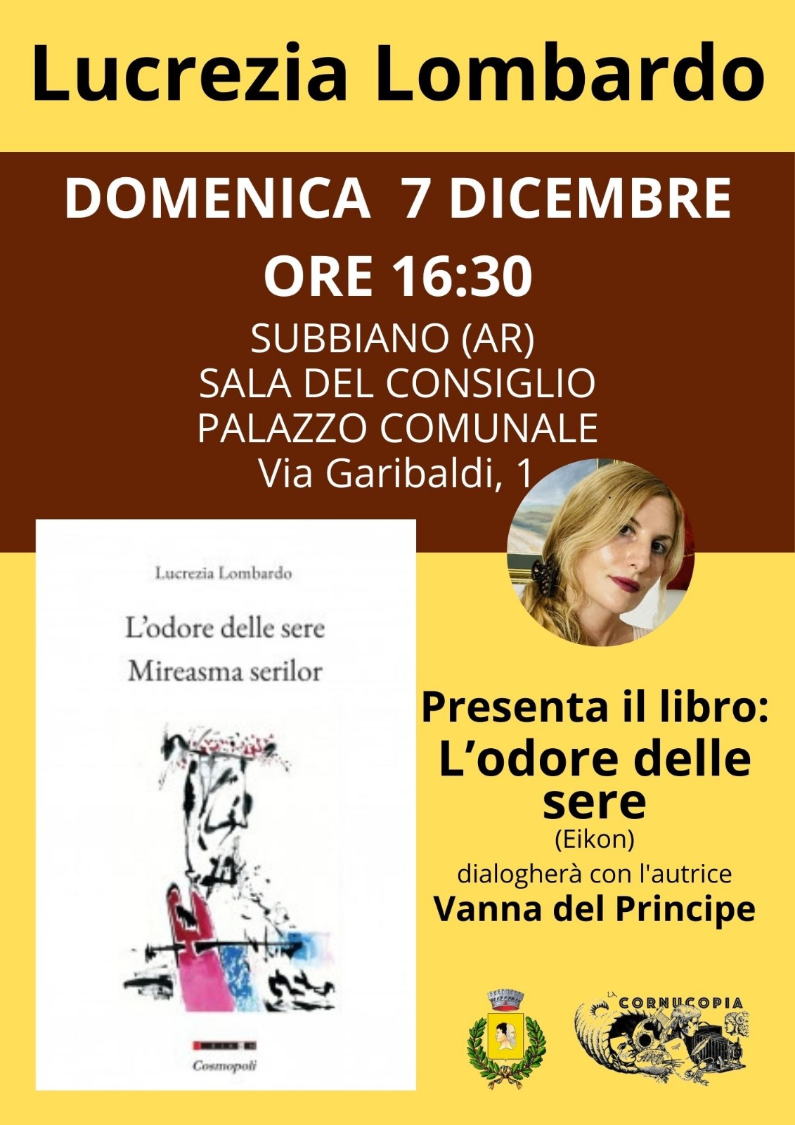 Il Comune di Subbiano e l'Associazione La Cornucopia vi invitano alla presentazione del libro "L'odore delle sere. Mireasma serilor" di Lucrezia Lombardo.
